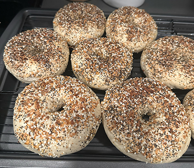 - Alternate spreading on each bagel between Egg Wash and Everything Bagel Seeds.